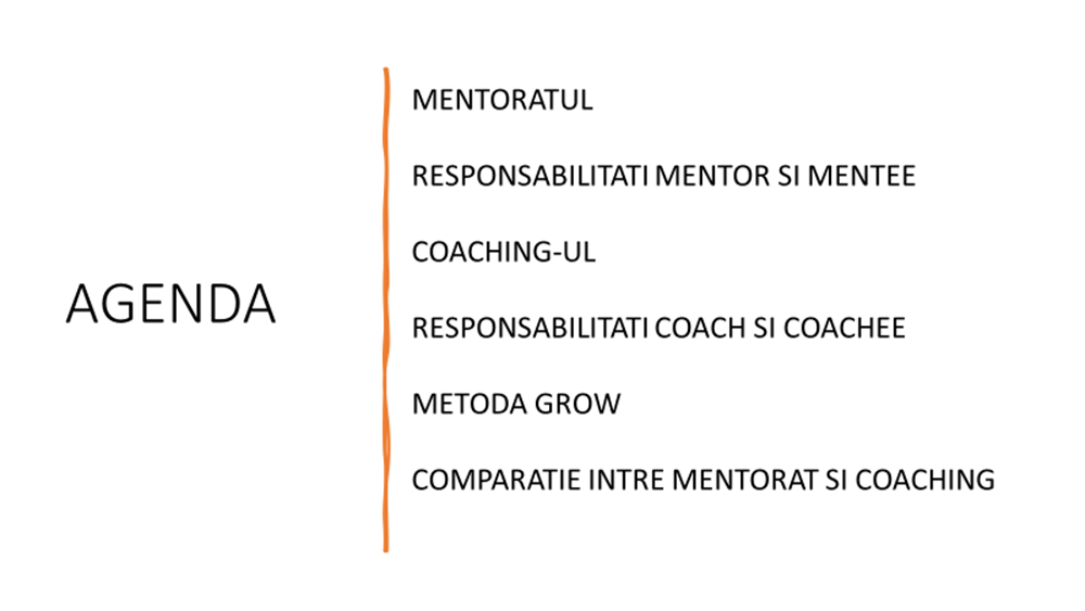 Obiectivul acestei sesiuni de training este de a construi o abordare structurata in ceea ce priveste procesul de mentorat si coaching, o  metodologie pe care cursantii sa o urmeze pas cu pas.
