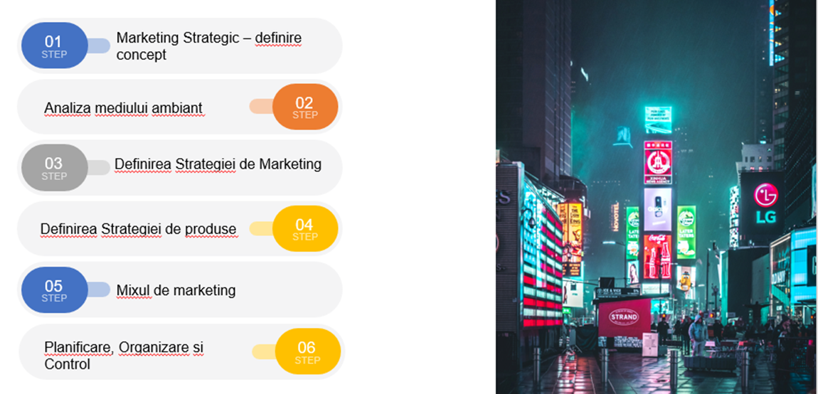 Vei afla prin ce se diferentiaza marketingul strategic de cel operational, cum sa te pozitionezi fata de competitie, fata de piata, de consumatori, de intregul mediu ambiant, luand in considerare misiunea si viziunea businessului tau dar si capabilitatile acestuia. Este bine sa fii constient de aceste informatii, pentru a putea trece la o abordare mai bine integrata, sa iti poti stabili obiective masurabile, un mix de marketing adaptat situatiei businessului tau, KPI pe care sa ii monitorizezi si modalitatile de evaluare si control.