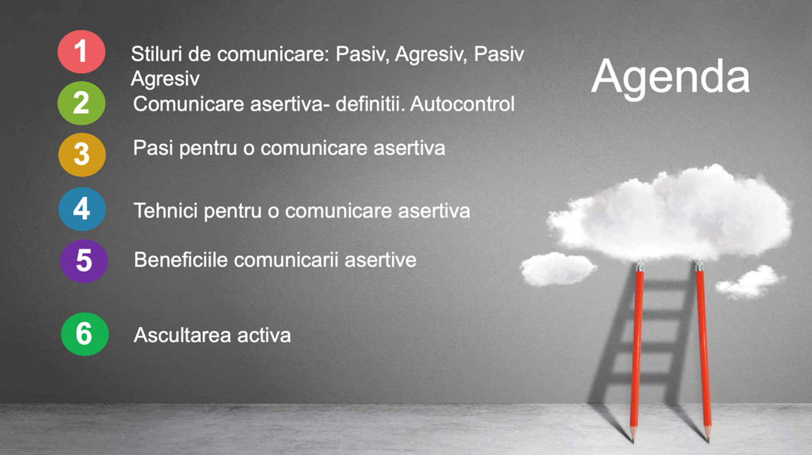 Obiectivul acestui program de training este de a înțelege mai bine specificul conceptului de Comunicare asertiva:  care sunt definițiile date acestui tip specific de comunicare, ce este auto-controlul si la ce servește, care sunt pașii de parcurs pentru a ajunge sa avem un stil de comunicare asertiv, ce tehnici pot fi folosite pentru comunicarea asertiva, ce implica ascultarea activa si care sunt beneficiile comunicarii asertive.