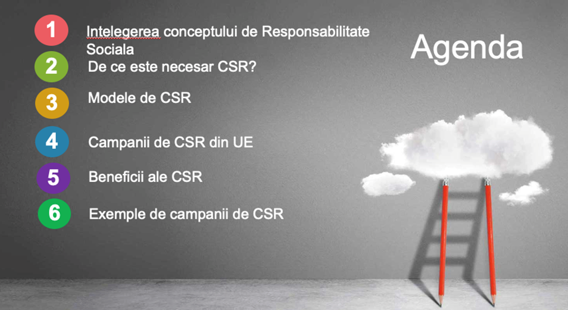 Obiectivul acestui program de training este de a intelege mai bine specificul conceptului de Responsabilitatea sociala, cele mai des adoptate modele de responsabilitate sociala, campaniile de CSR sustinute de UE, cu ce beneficii vin campaniile de CSR, atat pentru companie, cat si pentru angajati si prezentarea unor campanii celebre.