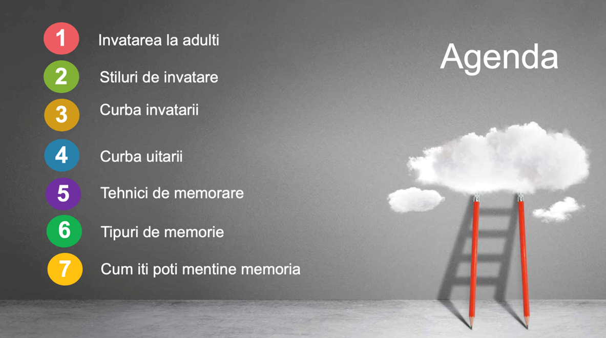 Obiectivul acestui program de training este de a înțelege mai bine specificul conceptului de Strategii de invatare:  care este specificul invatarii la adulti, care sunt stilurile mari de invatare, ce este specific curbei invatarii si curbei uitarii. Materialul propune de asemenea si mai multe tehnici pentru imbunatatirea memorarii, prezinta tipurile de memorie si modalitati de a mentine memoria antrenata pentru cat mai mult timp.